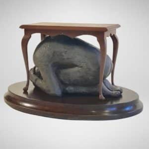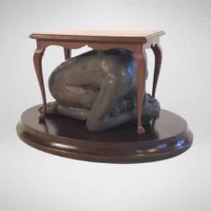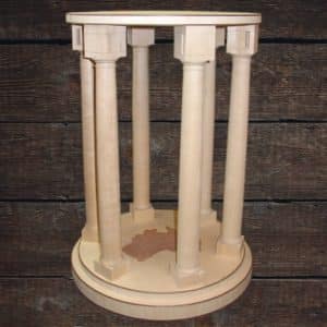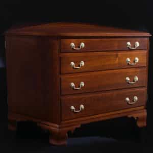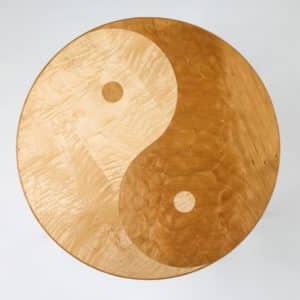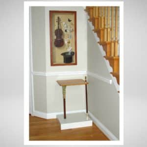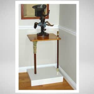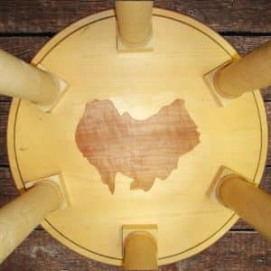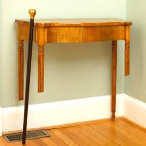 Creative, attractive and fully functional, this table is essentially a smaller version of a William and Mary drop leaf table. Fold in the single swing leg, drop the top, and it is ready to be tucked away against a wall. When folded, the table shows off the beautiful grain of the top. The 28″ diameter top stands 27″ off the floor when open.